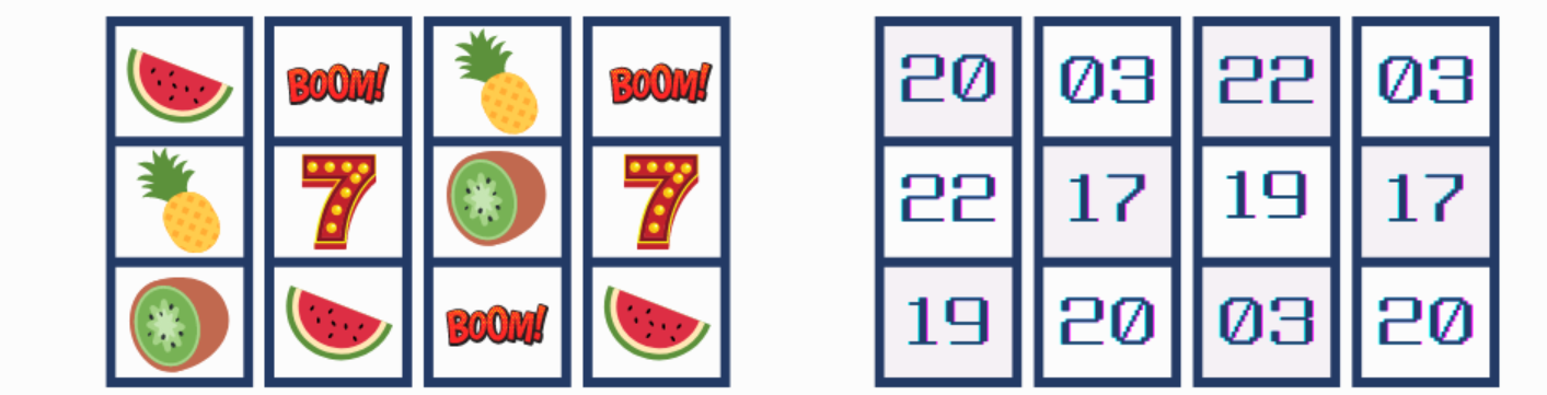 老虎機內部都有一個電腦晶片,叫做隨機數生成(簡稱RNG),以下圖為例,左邊圖案相當於右邊一個數字,按下旋轉鈕時,隨機數生成器即停在一組亂數字上。(左邊通常為玩家看到的畫面,右邊則是機器內部顯示的畫面。)